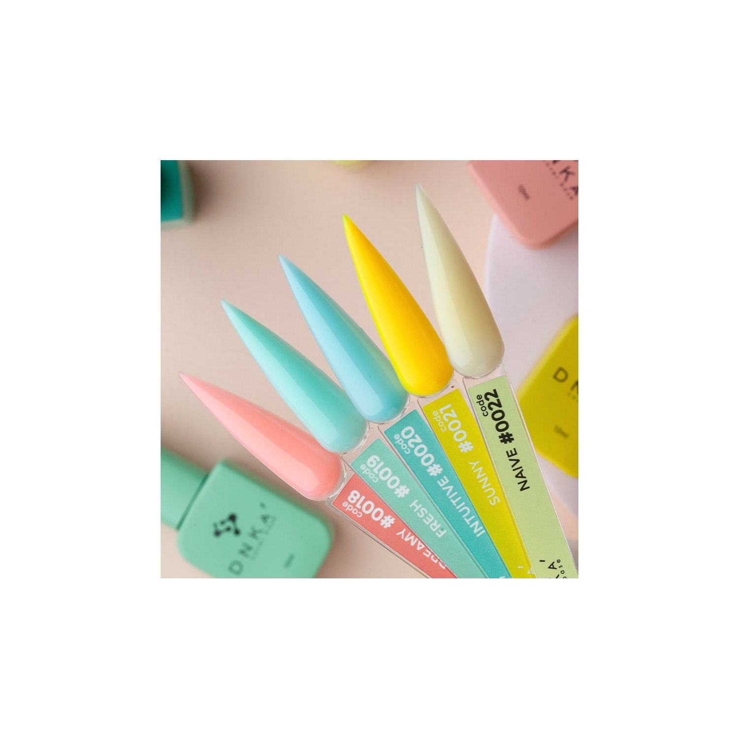 5. Decken Sie die Nägel mit DNKa’ Top No Wipe oder DNKa’ Top Matt No Wipe ab. Für einen idealen Glanz- oder Matteffekt empfehlen wir eine zusätzliche Aushärtung von etwa 2 Minuten unter einer LED- oder Hybridlampe. Bei UV-Geräten verlängert sich die Zeit auf 3 Minuten.